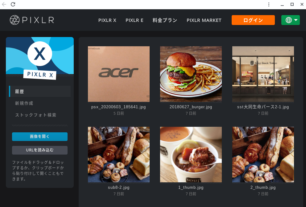 「履歴」や「画像を開く」から加工したい画像を選びます。
